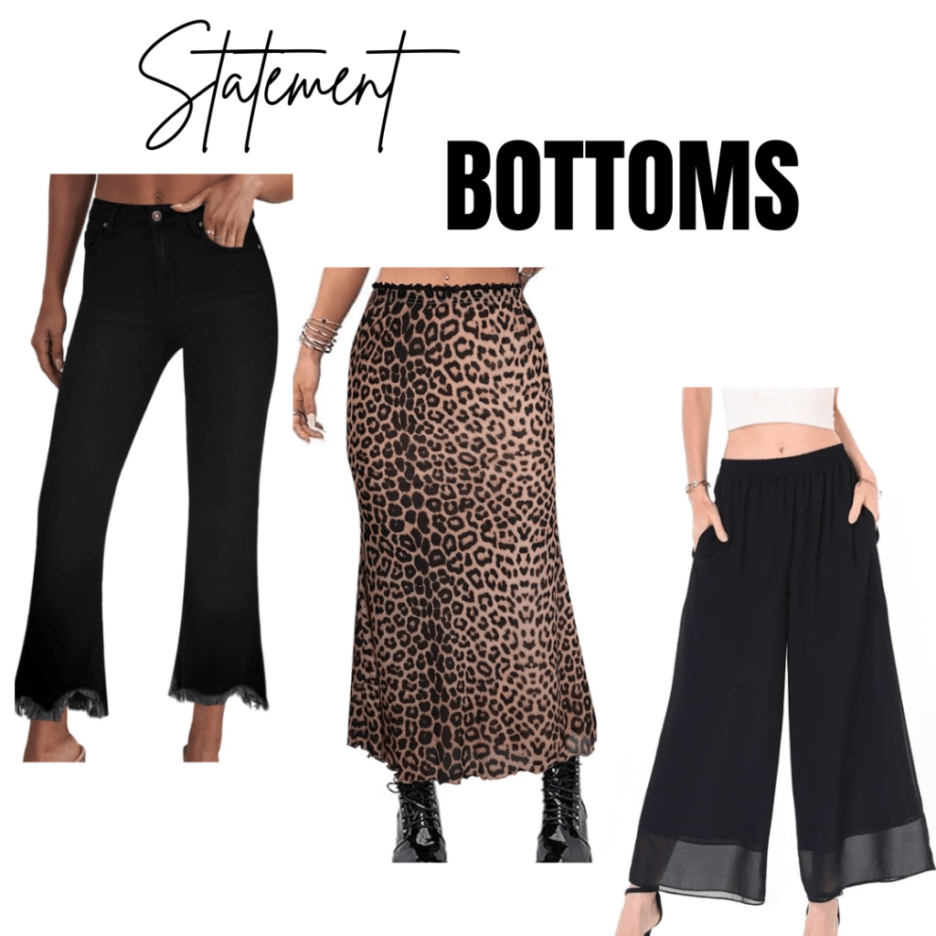 Ditch the skinnies if you’re over them—try black wide-leg pants, dark flares, or even better: a leopard print midi skirt. This unexpected piece adds just enough wild energy while staying breathable for summer nights.