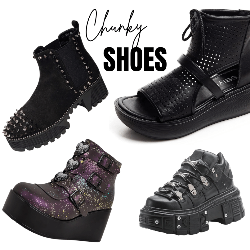 Think chunky platform boots, combat-style sandals, or metal-accented sneakers. These give you height and attitude without killing your feet halfway through the set.